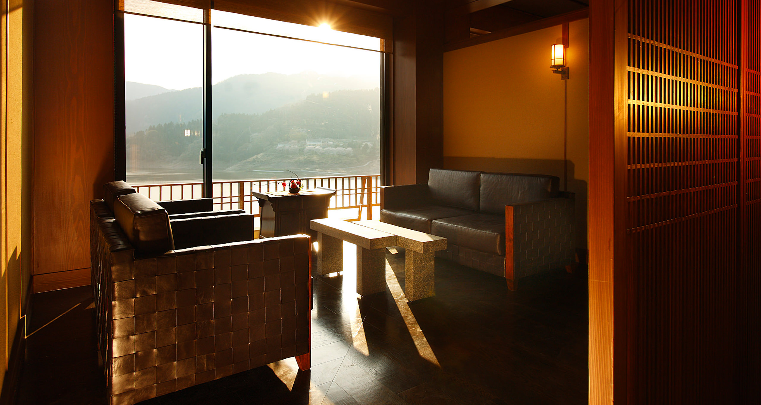 夕暮れの湖を眺めながらゆっくりとお食事を楽しんでいただける個室の食事処。
