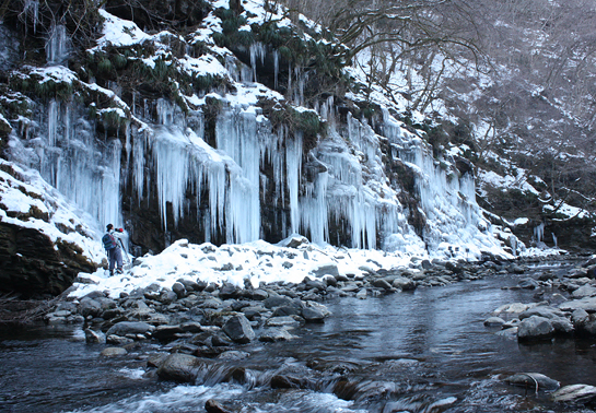 大きく切り立つ岩肌の一面に、まるで滝のような氷柱が現れます。