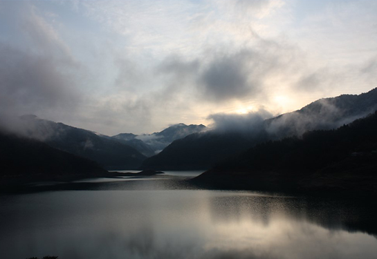 霧の中に浮かぶ山々は、まるで水墨画のようです。