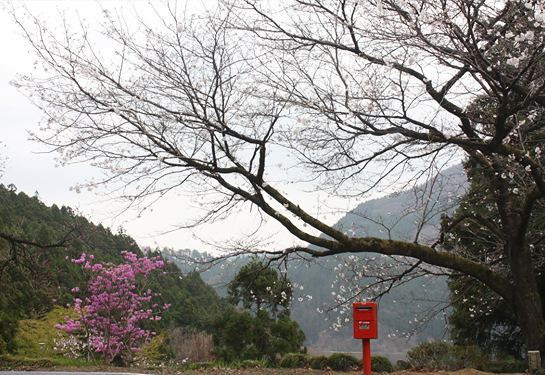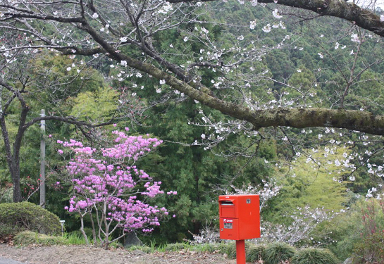 山水の手前にある「桜」ががちらほらと咲き始めました。